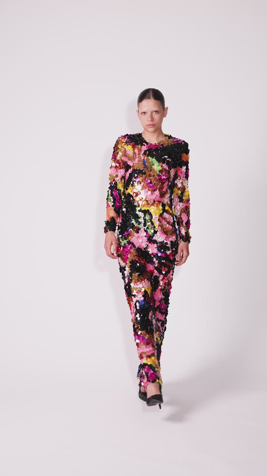 Long bias-cut dress, hand-embroidered in clouds of multicoloured pailettes. The sequins catch the light softly and the dress drapes close to the body with an easy, fluid line.