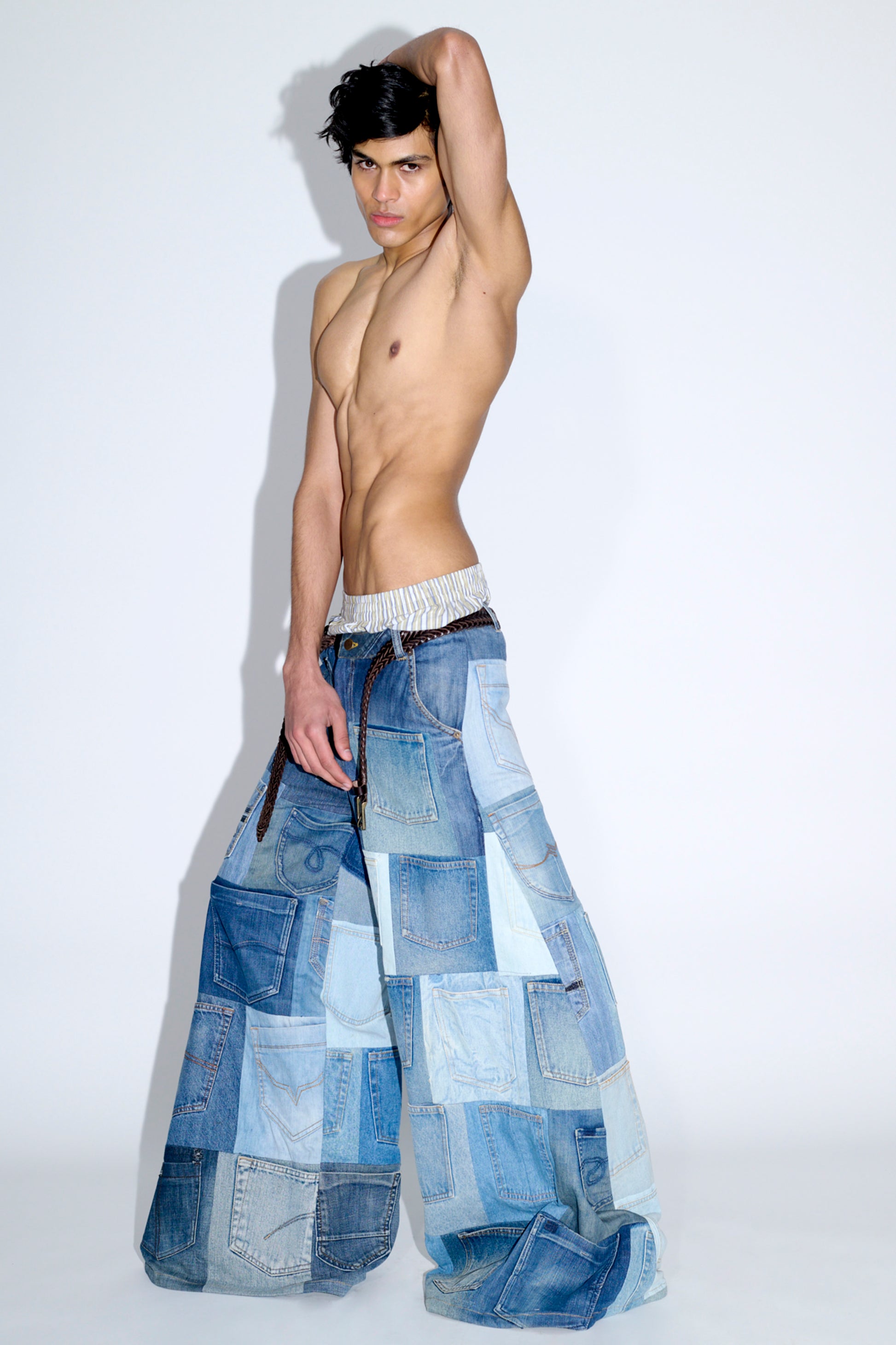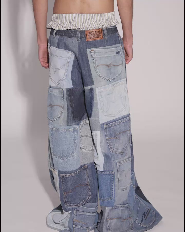 Crafted from up-cycled denim, these patchwork jeans give new life to vintage jean pockets, making each pair truly one of a kind. Cut with a low waist and a stylishly wide flared leg, they blend nostalgia with a modern edge.