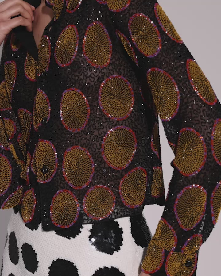 This chiffon shirt is hand-embroidered with tiny glass beads and thread in a polka dot pattern. Cut on the bias for a flattering silhouette, the intricate beading catches the light and creates a magical sparkle.