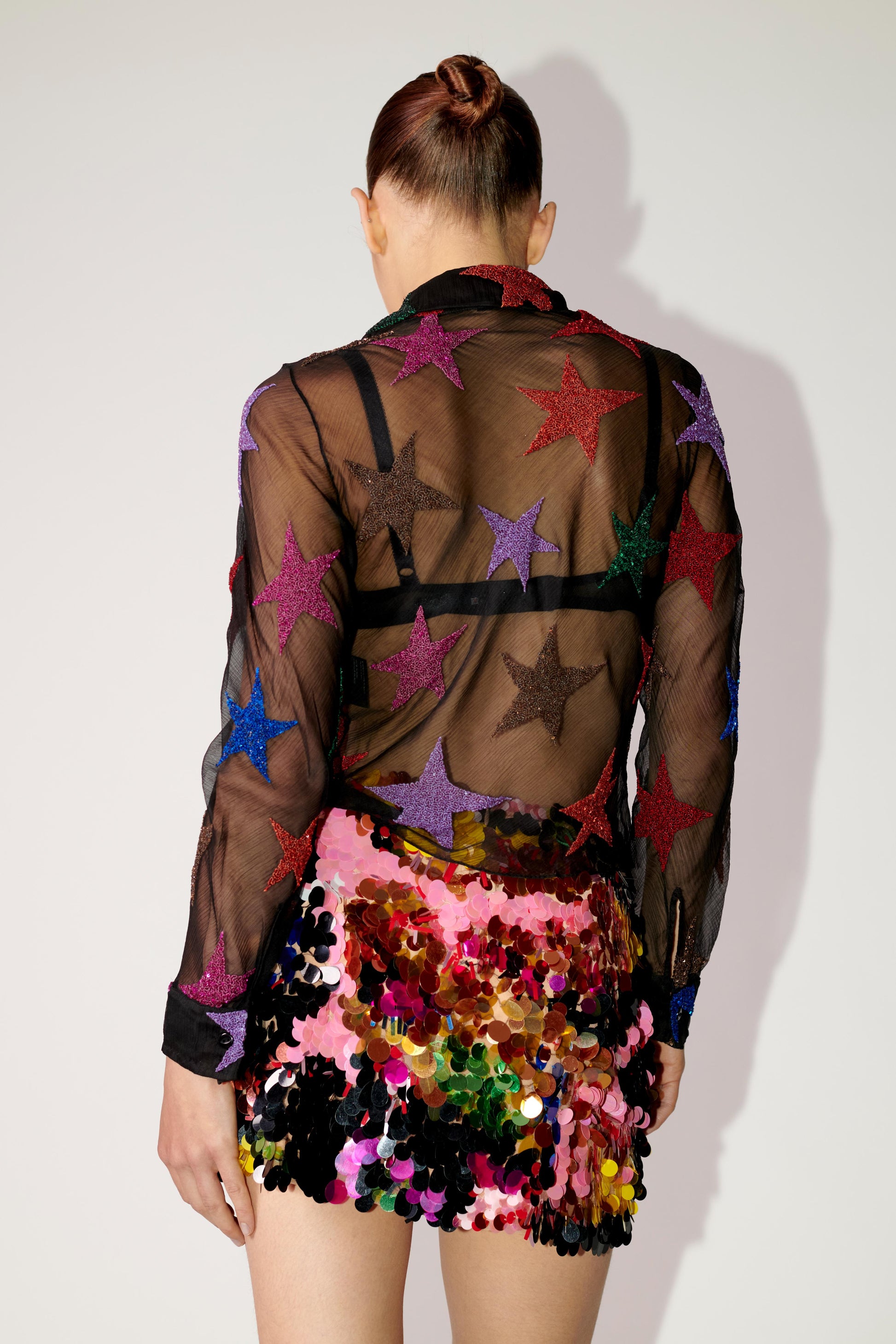 Black silk chiffon shirting with a bias cut for flattering fit. Hand embroidered glitter stars scatter across the fabric for maximum drama.